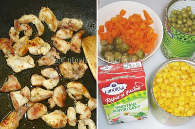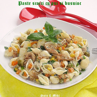 Pieptul de pui se taie cubulete si se prajeste in putin ulei de masline pana capata culoare. Pastele se fierb conform instructiunilor de pe ambalaj. Dupa ce au fiert se pun intr-o sita, se clatesc cu apa rece si se lasa la scurs.