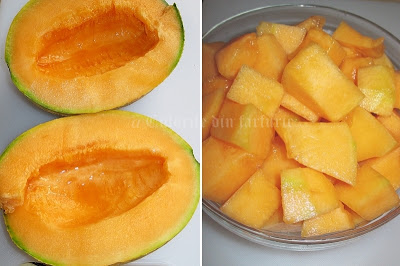 Pentru mousse, se alege un pepene galben, din aceela putin necacios, ca nu e asa apos si are o culoare superba. Se cureta pepenele de coaja si samburi, apoi se taie in cuburi. Se opreste o felie subtire pentru ornat. Eu am avut un pepene de 1,400 kg. care dupa curatare a ramas 1,200 de pulpa.