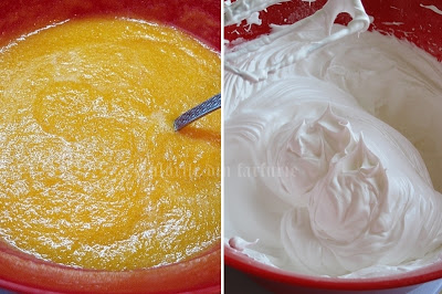Prepararea blatului: Se bat albusurile cu un praf de sare pana se obtine o spuma tare. Se adauga lingurile de zahar, zaharul vanilat, galbenusurile, lingura de apa rece.