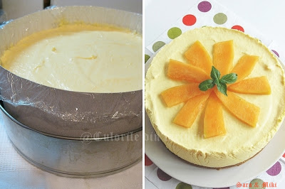 Eu am facut un cerc cu o fasie de carton si am imbracat forma pe interior in folie de plastic. Asezam blatul, dupa care rasturnam moussul de pepene. Daca vreti puteti insiropa blatul. Eu nu am facut-o am lasat sa-si ia umezeala de la mausse.