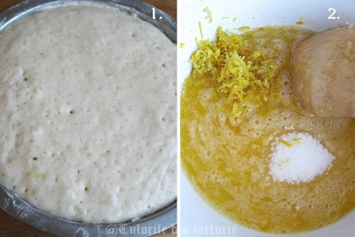 Daca utilizati drojdie uscata, trebuie doar sa amestecati drojdia cu apa calda si sa lasati sa stea pentru cateva minute pana cand apar bulele ( 1 ). Se amesteca 60 g de zahar, 1 ou , coaja de la 1/2 de lamaie, uleiul ( 2 ).