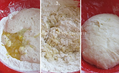 Apoi se rastoarna peste faina. Daca doriti puteti sa folositi un mixer sau sa framantati cu mana, ca mine, timp de aproximativ 10 minute. Forma-ti o minge, pe care o lasati in vas, acoperiti cu un prosop curat si lasati sa creasca intr-un loc cald, pana cand isi dubleaza marimea ( 3 ).