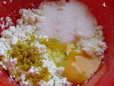 Intre timp se pregateste amestecul de branza. Intr-un castron, se amesteca branza ricotta cu restul de 60 g de zahar, 1 ou, cealalta jumatate din coaja de lamaie si stafidele pe care eu am uitat sa le adaug ( 4 ).