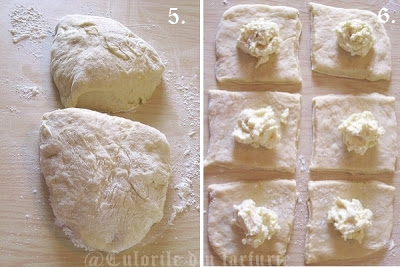 Se intinde aluatul. Ca sa putem lucra mai usor se imparte aluatul pe jumatate ( 5 ). Se intinde pe rand fiecare jumatate de aluat si cu un cutit sau rola de patiserie se taie in 6 bucati egale de 7-8 mm . Chiar daca pare subtire acesta va mai creste. In fiecare centru de patrat asezam aproximativ 2 lingurite de amestec de branza ( 6 ).