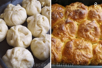 Cu degetele se ridica cate un colt, apoi cel opus si se prinde în mijloc. Luam fiecare colt ramas si il prindem din nou in centru, astfel ca rezultatul sa arate ca o floare ( 7 ). Se mai lasa sa stea inca 10 minute sa mai creasca un pic. Din aceaste ingrediente vor iesi 12 bucati. Se coace in cuptorul incins dinainte timp de aproximativ 50 de minute sau pana se rumeneste ( 8 ).
