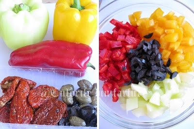Ardei colorati se spala, se inlatura cotoarele si se taie în cuburi. Drojdia uscata se dizolva in laptele caldut ca de paine. Rosiile uscate si marinate în ulei (se gasesc in supermarket) se taie in felii subtiri.
