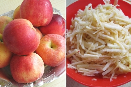 Intr-un castron se combina ouale si zahar, dar nu cu mixerul. Se adauga coaja de lamaie, se amesteca impreuna, dupa care se adauga si cele 2 linguri de faina si sarea. Adaugam si merele rase folosind o spatula.
