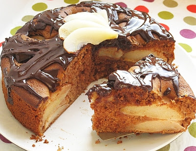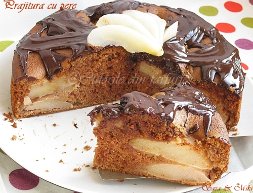Cum perele se asociaza cu ciocolata, am topit restul de 100 gr ciocolata, cu putin lapte si 2-3 linguri de lapte si am turnat-o peste prajitura. Pofta buna!