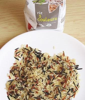 Si daca tot avem sos chinezesc, acesta trebuie servit neaparat langa un orez. Am gasit in supermarket un orez in trei culori, asa scria pe pachet. Este un orez de calitate care nu se fierbe prea mult, iar bobul lung si frumos nu se sfarama.