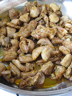 Bucatile se distuie intr-o tigaie cu ulei de masline. Cand a prins culoare, se adauga putina supa si se lasa 15-20 minute sa fiarba. Apoi se scot din tigaie.