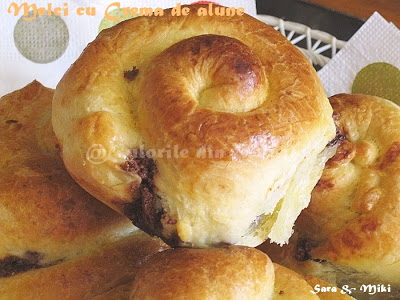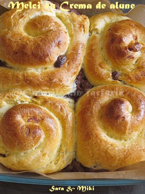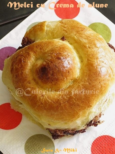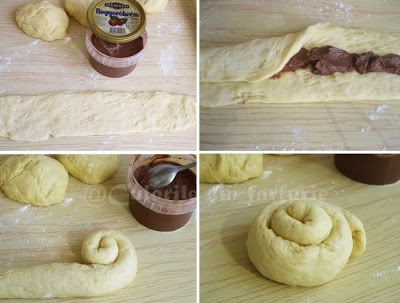 Fiecare biluta de aluat se intinde pe lungime, intr-o foaie subtire pe care o ungem cu nutela sau orice alta marca de pasta tartinabila de alune. Se inchide apoi si se ruleaza in forma de melc, pornind din interior spre exterior. Din imagini se poate intelege mai bine.