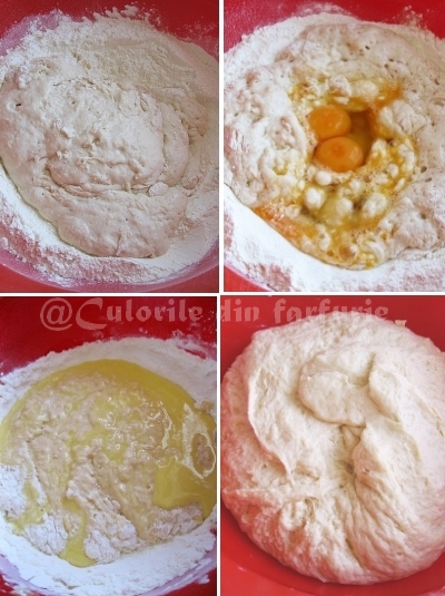 Se framanta totul foarte bine, timp de 10-15 minute pana se obtine un aluat ca pentru cozonac. Nu trebuie să fie nici prea moale, nici prea vartos. Apoi se lasa la dospit pana in momentul in care isi dubleaza volumul.