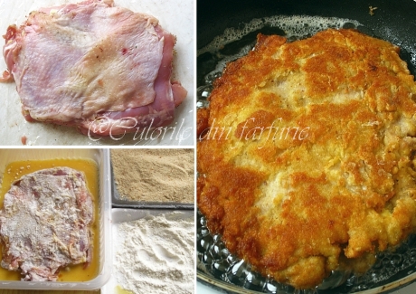 Se acopera cu cealalta jumatate de carne de pui si se prinde in scobitori, daca este cazul. Se pregatesc apoi trei farfurii cu: faina, ou batut si pesmet si procedam la fel ca la snitel.