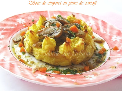 Soteul de ciuperci se serveste cald, simplu sau cu garnitura. Eu am facut un piure de cartofi din: 3 cartofi potriviti, 50 g ulei; putina zeama in care au fiert cartofii, sare, apoi aranjam ca-n imaginea de mai sus si dam la cuptor cat sa prinda o crusta.