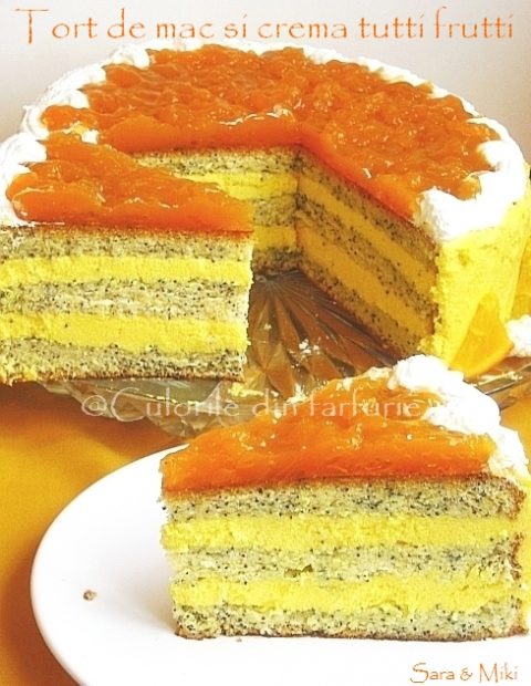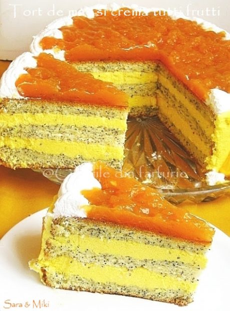 Se opreste mixerul si se incorporeaza si faina si macul. Compozitia se va turna intr-o forma de tort cu pereti detasabili, diametru de 23 cm si se da blatul la cuptor pentru 30-45 de minute. Blatul racit se taie in 3 foi si se insiropeaza cu un sirop din 250 ml apa si 150 g zahar.