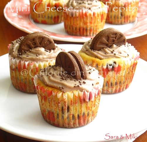 Intr-o tava de 12 muffins / briosede, aseazam cupele de hartie, iar in ele asezam biscuiti Pepito. Peste acestia adaugam crema de branza, amestecata cu bucati de biscuiti.