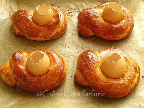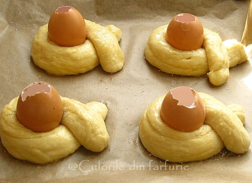 Cand aluatul s-a dospit, rupem bucati de aluat pe care le facem suluri de cca. 20 cm. lungime. Le dam forma din imagini si ca sa-si mentina golul pentru oua si cand vor fii scoase din cuptor, folosim coji de oua ramase de la alte preparate.