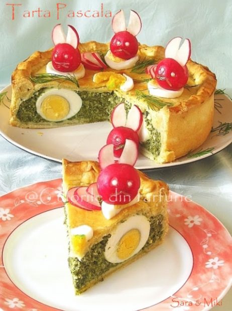Se unge tarta cu ou batut, apoi dam la cuptorul incins in prealabil pentru cca. 45-50 de minute. Cand se scoate din cuptor se desprinde peretele formei, se lasa sa se raceasca putin, apoi se decoreaza cu oul fiert taiat felii, ridichi transformate in iepurasi si verdeata.