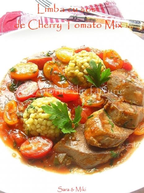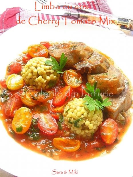 Se adauga apoi si ceapa calita. Se stinge cu un polonic de zeama in care a fiert limba, pasta de rosii si se lasa cateva clocote. Se taie cherry tomato mix in jumatati sau sferturi, se adauga si se mai lasa sa scada.