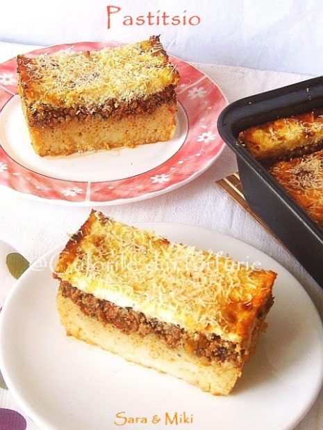 Branza rasa este adesea presarata deasupra. Acest fel de mancare se coace si este o varianta a preparatului italian, pasticcio di paste. Pastitsio este adesea servit ca fel principal, cu o salata. Sursa de inspiratie a fost Rico Sin Azucar.