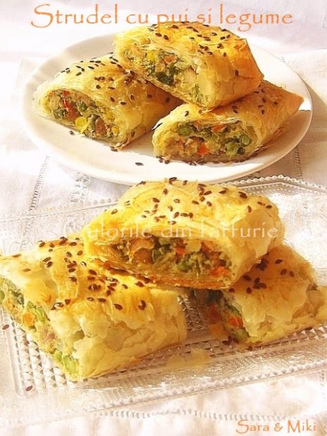 Strudelul este un produs de patiserie care are o umplutura. Pe la anul 1690, de cand dateaza prima reteta de strudel, gasita la Biblioteca orasului Viena, umplutura era dulce, dar dupa 1800 s-a diversificat si au aparut si umpluturi cu carne, ciuperci, branza, varza… Iata un Strudel cu umplutura sarata, de carne si legume.