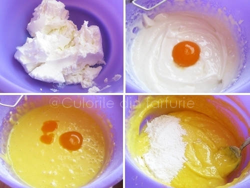 Separam albusurile de galbenusuri. Intr-um bol potrivit de mare, batem cu mixerul crema de branza cu zaharul farin pana devine o pasta cremoasa.
