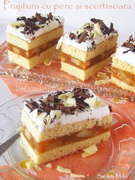 Se intinde peste prajitura si pentru ca perele merg bine cu ciocolata, am ras ciocolata alba si cu lapte deasupra ca decor.