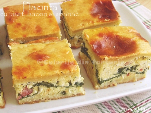 Placinta cu iaurt, bacon si spanac, acesta e o reteta asemanatoare cu Placinta cu zucchini si feta. Umplutura de iaurt, telemea, bacon si spanac ii da o consistenta si un gust special. Placintele, fie ca-s sarate sau dulci, sunt minunate in orice moment al zilei.