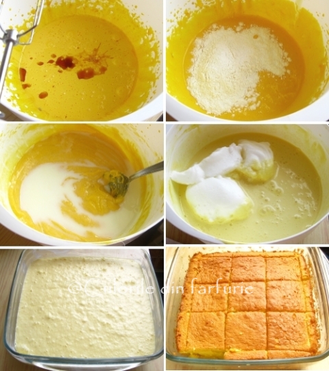 Va rezulta un aluat subtire care se toarna in vasul de copt de 20×20 cm si se da la cuptorul preincalzit la 160 °C, timp de 60 de minute sau pana cand partea de sus devine aurie.