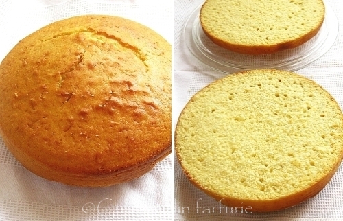 Tapetam o forma de tort de 23 cm in diametru cu hartie de copt si apoi rasturnam aluatul. Coacem in cuptorul preincalzit la 170 °C, cca. 50 de minute, dar numai dupa ce trece testul cu scobitoarea scoatem forma din cuptor. Blatul va creste putin pe centru, dar taiem acest „mot” si-l mancam noi, iar pe restul il taiem in doua discuri. Acest blat l-am mai folosit si la Tort cu aspic de struguri si Tort marmorat cu crema de unt de arahide.