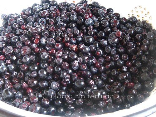 Se pune intr-un vas, se adauga zaharul, se acopera cu folie de plastic si se lasa la o parte minim 2 ore, pentru a permite zaharului sa se dizolve in sucul lasat de afine. Eu am lasat de seara pana dimineata. Se mai amesteca intre timp pentru asi lasa sucul.