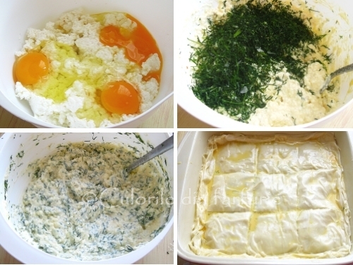 Se unge o forma / tava de 21×21 cm. Foile de placinta se impart in doua, se aseaza prima jumatate de foi, unse fiecare cu ulei de masline. Se adauga peste foi umplutura de branza si se acopera cu restul de foi de placinta.