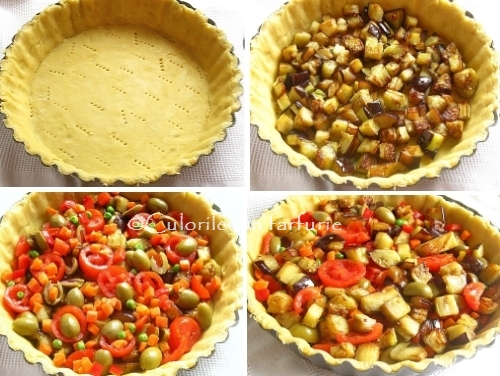 Intindem aluatul cu un sucitor pe o planseta cu faina si apoi o asezam in forma de tarta. Intepam fundul tartei cu o furculita si o dam 5-6 minute la cuptor la foc tare 200 °C. O scoatem si asezam deasupra umplutura: cuburile de vinete, maslinele taiate pe jumatate, pumnul de morcovi si mazare, rondelele de rosii si acoperim cu restul de vinete.