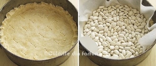Intr-o forma de tort de 23 cm diametru, se intinde aluatul fraged, imbracand pereti formei doar cca. 2 cm. Se aseaza o hartie de copt si deasupra se aseaza fasole sau mazare, care prin greutatea lor va impiedica aluatul sa se ridice, apoi se da la cuptor pentru 15 minute.