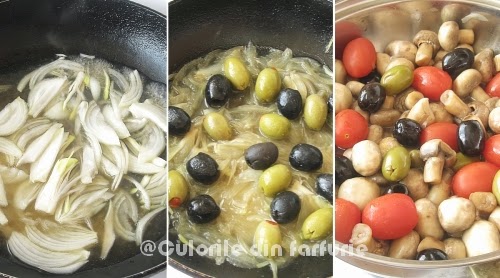 Intr-o alta tigaie se caleste ceapa taiata julien. Se mai adauga putina apa sau supa de legume ca sa nu se arda, iar cand a devenit sticloasa se adauga 5 masline megre si 5 verzi fara sanburi si se lasa 3-4 minute sa fiarba maslinele.
