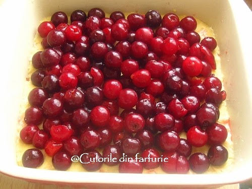 Folosim o tava de 20×20 cm. Aluatul de baza il intindem in tava si asezam deasupra visinele curatate de samburi.