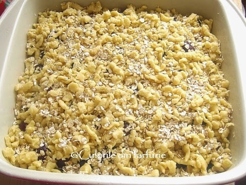 Razalim treimea de aluat rece prim razatoarea mare, uniformizam pe toata suprafata intercaland cu migdalele tocate si ovazul. Daca aluatul e moale si se rade greu, se mai poate adauga putina faina.