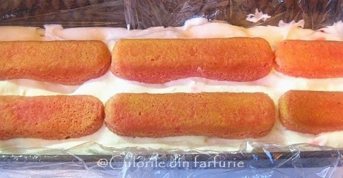 Rasturnam si restul de crema, apoi complectam cu alt strat de zmeura si inchidem cu al doilea strat de piscoturi. Acestea se aseza alaturi unul langa altul intrucat va fii baza prajiturii.
