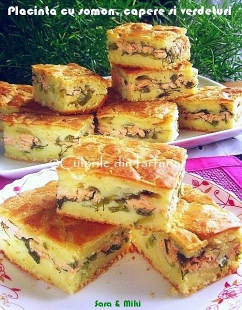 Intr-un vas de 20 x 20 cm uns cu margarina se pune jumatate din aluat. Se imprastie uniform deasupra straturi de ceapa, bucati de somon, capere si marar tocat mare. Se asezoneaza dupa gust cu condiment de peste si cimbru uscat.