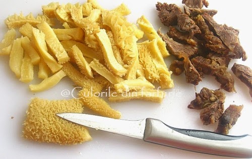 Cum eu am folosit burta de vita gata semi-pregatita care fierbe mai repede, cand oasele au fost pe jumatate fierte am adaugat si bucatile de burta. Cand au fiert se scot impreuna pe o farfurie si se lasa sa se raceasca. Carnea se ia de pe oase si cu burta se taie fideluta.