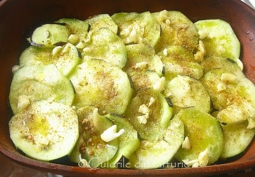 Se stropeste totul cu ulei si putina apa, se pune capacul si se da vasul roman la cuptor la 180 °C pentru 25-30 de minute. Pofta buna!
