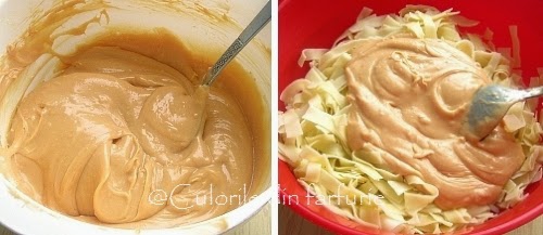 Dupa ce se incorporeaza cele 3 galbenusuri, se adauga cate o lingura din crema de caramel racita, mixand in continuare.