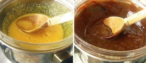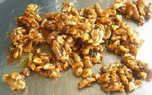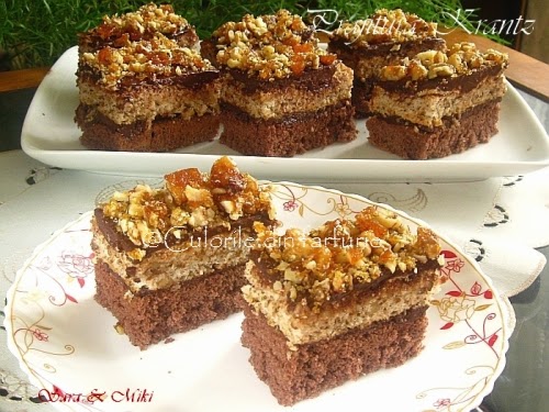 Pentru Krantz se caramelizeaza 100 g de zahar in care se amesteca 100 g de nuca. Se rastoarna rapid pe o tava metalica sau de sticla unsa cu putin ulei si se intinde. Se lasa sa se raceasca si apoi se piseaza fie in piulita, fie se pun intr-o punga de plastic si se bat cu ciocanul de paneuri. In imaginea de mai jos am mai multa cantitate ca mi-a trebuit si pentru alta reteta.