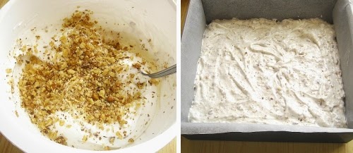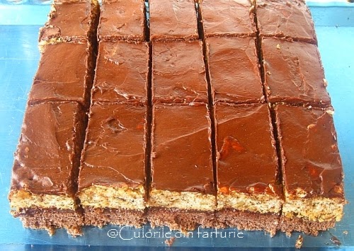 Asamblarea: Se aseaza blatul de cacao. Se intinde deasupra jumatate din crema de cacao, apoi se acopera cu blatul de bezea. Se acopera cu restul de crema. Se taie in bucati patrate sau dreptunghiuri.