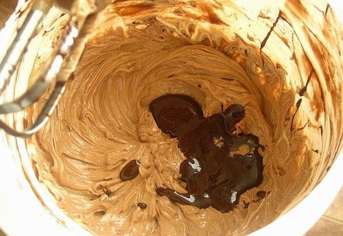 Separat intr-un bol, se mixeaza untul pana devine spuma, apoi se incorporeaza crema racita de galbenusuri cu cacao. Se da la rece pentru 20 de minute.