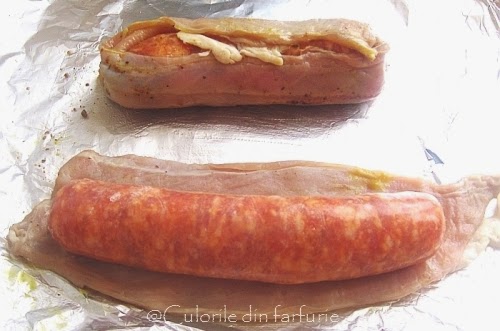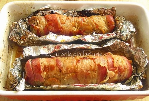 Se infasoara strans in felia de carne si apoi in 3-4 felii de bacon, in functie de cat sunt acestea de lungi. Se repeta si cu al doilea rulou, se aseaza fiecare pe o bucata de aluminiu unsa cu unt si ulei si se ruleaza strans.