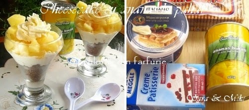 Se desface conserva de ananas si se scurge de sirop. Se aleg cele mai frumoase bucati de ananas, iar restul se taie in bucati mai mici si se amesteca in crema mascarpone. Se imparte crema in doua si se adauga in pahare peste biscuiti.