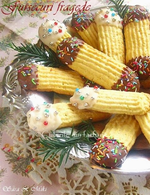 – Pentru glazura se taie ciocolata in bucati mici, se amesteca cu cate o lingura de ulei si se fierbe pe baie de aburi la temperatură mica, pana devine o masa compacta. Fursecurile se scufunda 2 cm in ciocolata, la un cap sau pentru diversitate la ambele capete. Se aseaza pe hartie pentru copt si se presara ornamente colorate cat ciocolata nu s-a intarit ca sa se lipeasca.