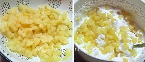Frisca lichida o mixam pana se intareste. Ananasul se scurge intr-o strecuratoare si se taie cubulete si se adauga in frisca.