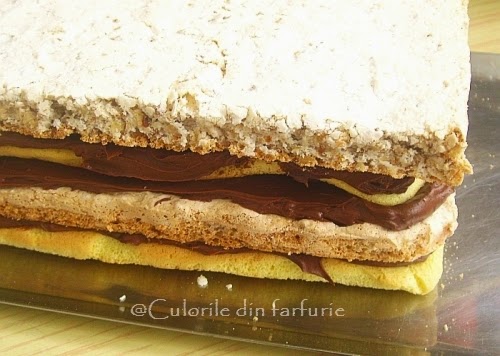 Se intinde prima jumatate de pandispan, deasupra 1/4 de crema ganache, deasupra jumatate de bezea, iar crema si se repeta. Se termina cu crema.